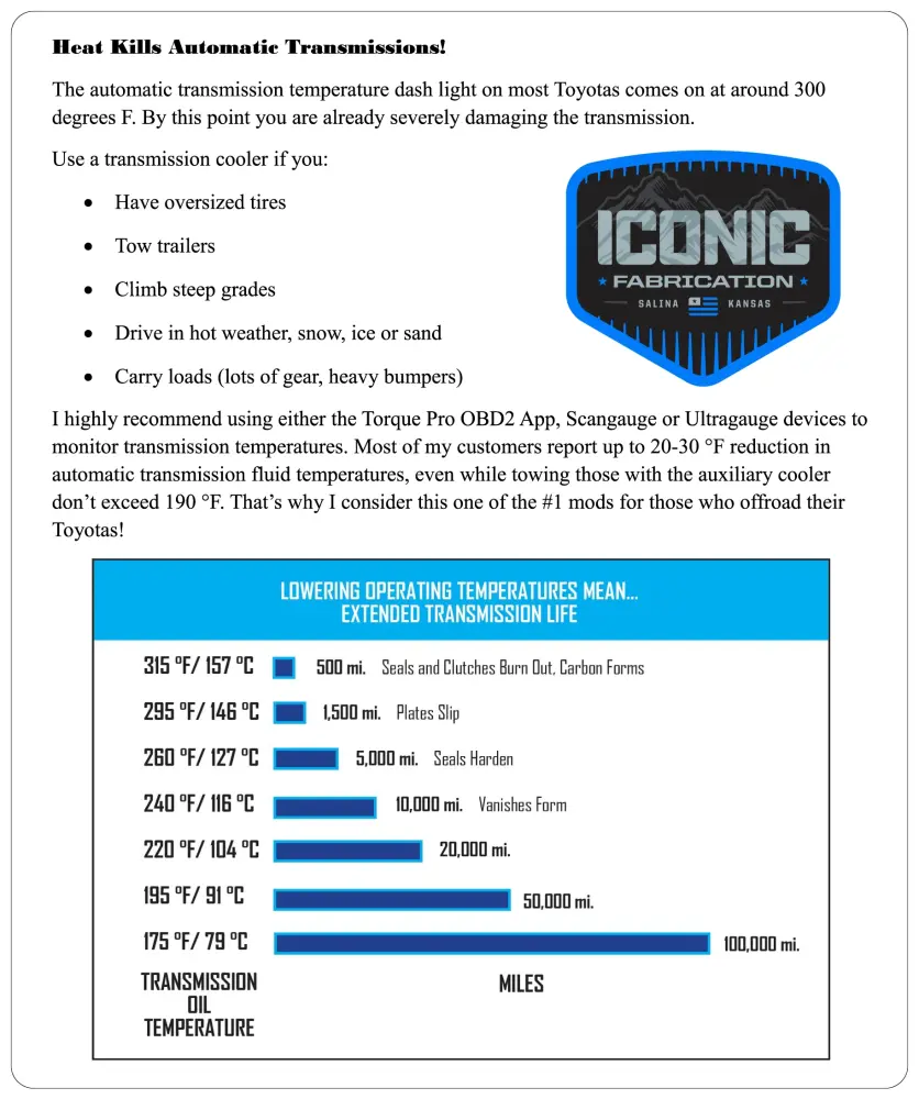 Reduce wear on your transmission by keeping temperatures under control! Featuring a “no-drill” install utilizing existing holes for an easy install process, these CNC pressbroke .125″ chunky 5052 Lightweight metal brackets make your transmission cooler upgrade a breeze. Compatible with all automatic transmission 2nd Gen (2005-2015) Tacomas.