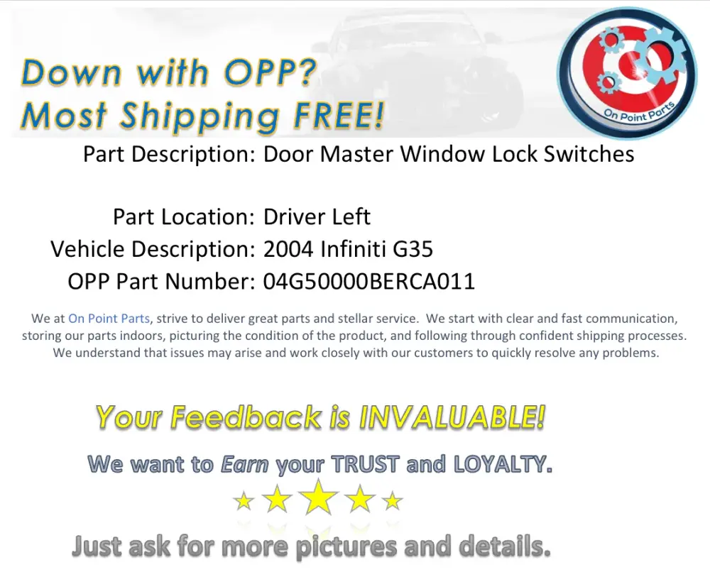 Infiniti G35 Driver Left Door Master Window Lock Switches OEM ● 5-Year Warranty on All Products ● Top Rated Quality – Customer Approved ▶ Limited time offer – Order now!