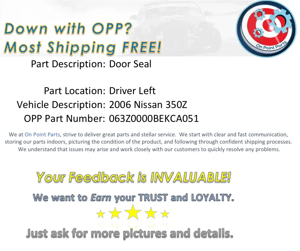 Nissan 350Z Driver Left Door Seal OEM 12BEKCA ✔ Free shipping on all orders ✔ 1-Year Manufacturer Warranty 🛒 Limited Stock – Reserve Yours