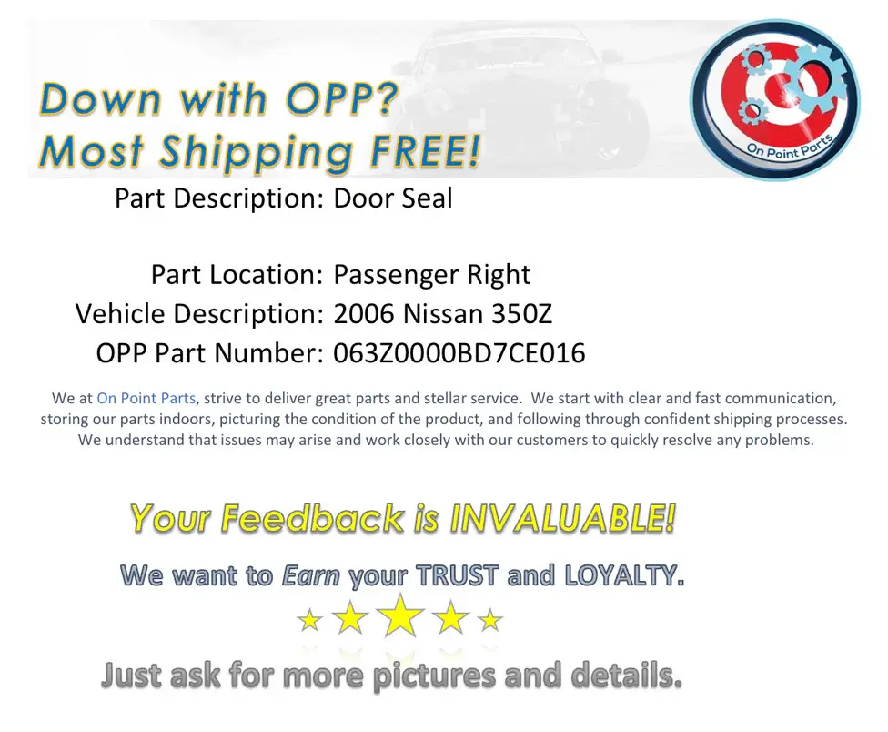 Nissan 350Z Passenger Right Door Seal OEM 12BD7CE ● Satisfaction guaranteed or your money back ● 3-Year Limited Warranty ▶ Reserve Your Spot Today