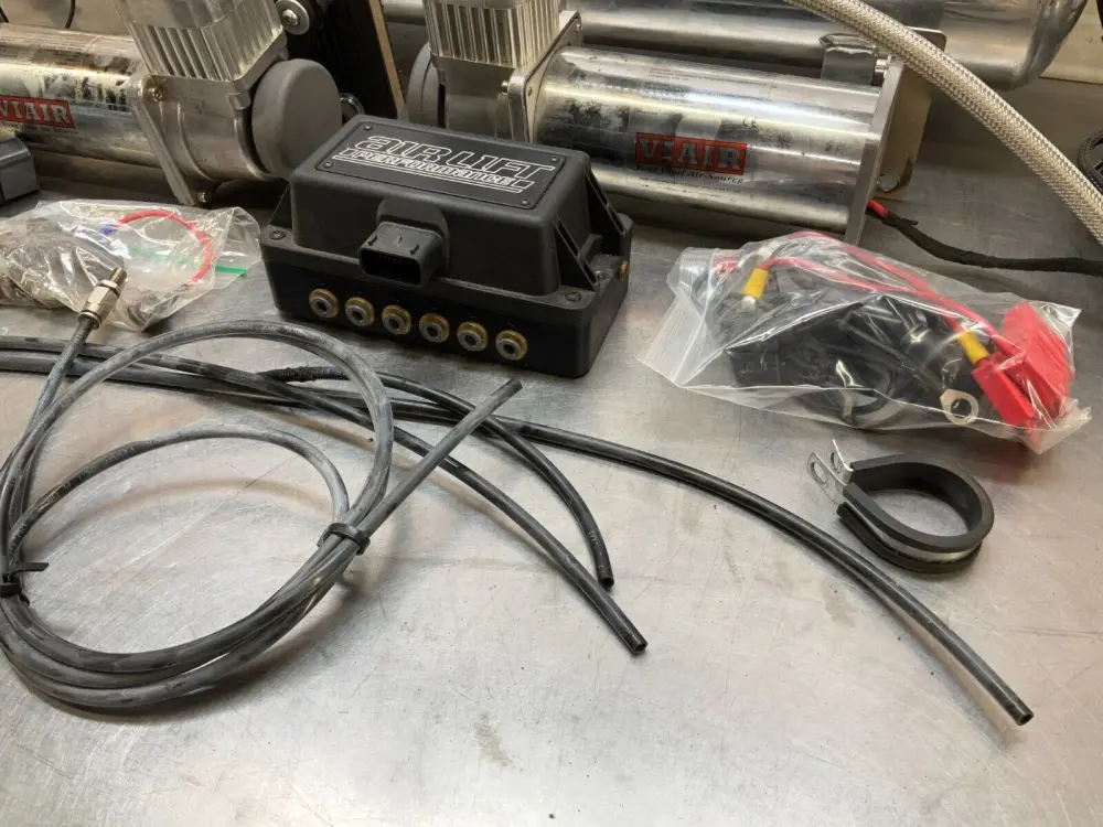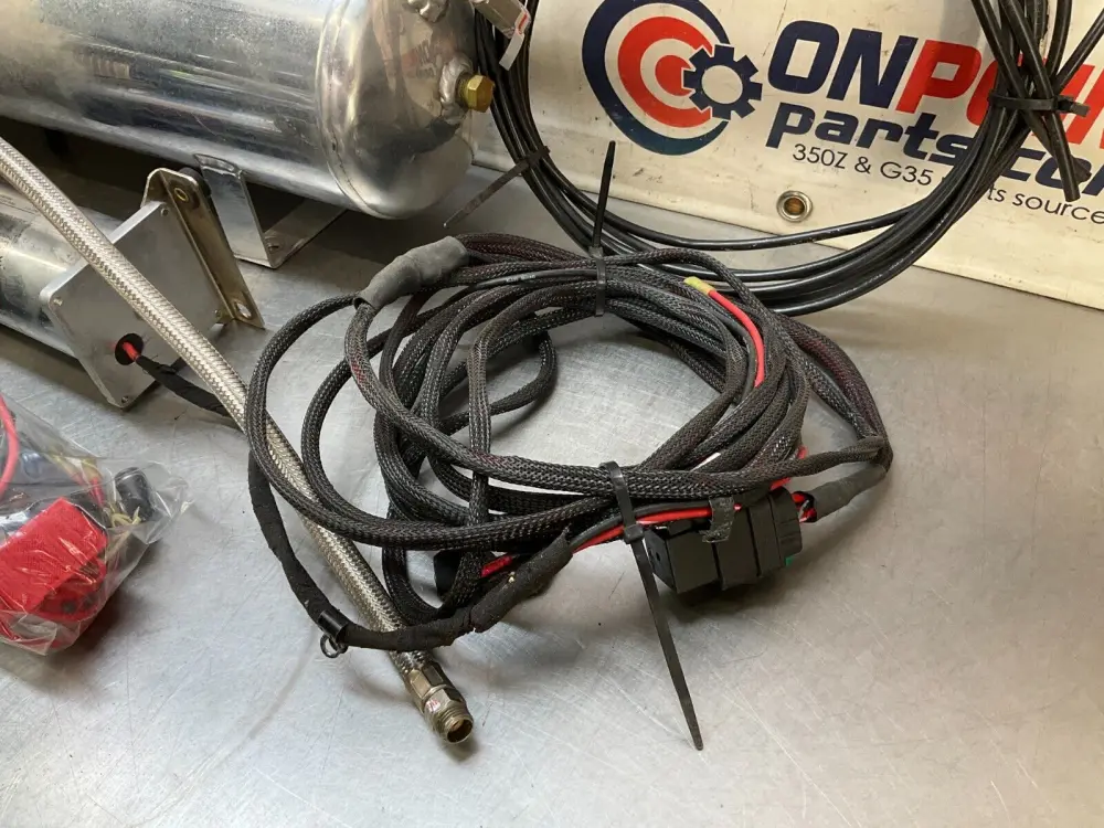 Note: Untested AirLift kit. This kit is not complete. Not sure what else is needed to complete this kit. This kit includes everything pictured; air tank, two pumps, air dryer canister, wiring and relays (spliced power and ground wires), pneumatic control box, inline fuse links, braided air hose and quarter inch lines.