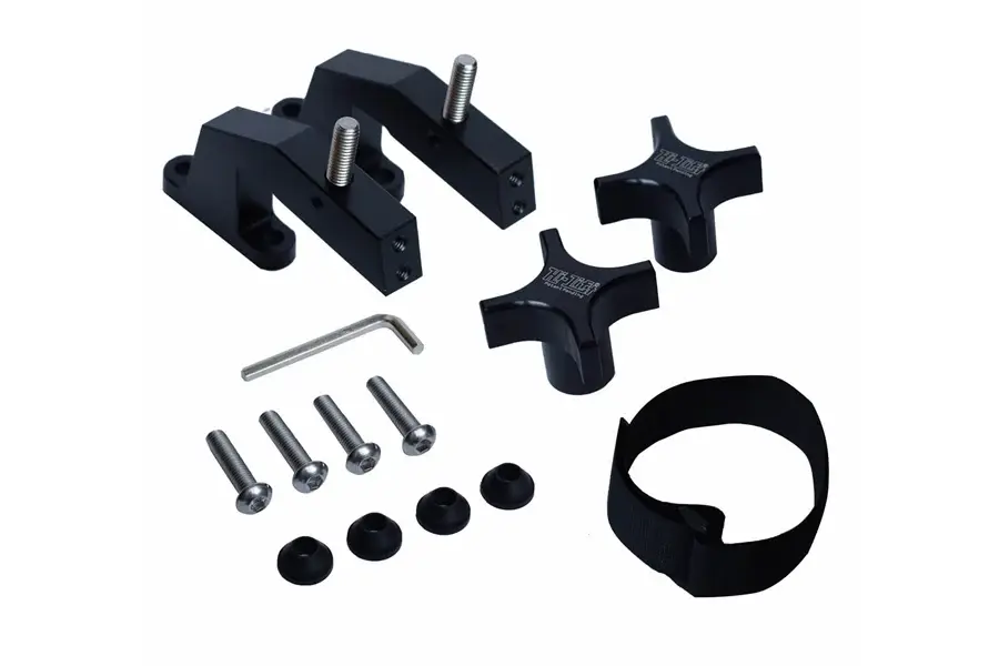 Mount your Hi-Lift Jack within effortless reach on your Wrangler! Mounts directly to existing hood hinge holes, no drilling required. 6061-T6 structural anodized aluminum for strength, durability, and a clean look.