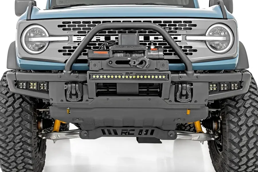 Superior Looks. Looking to take your off-roading game to the next level? Then you need a High Winch Mount! This bad boy works with factory steel interchangeable bumpers for your Ford Bronco and allows the installation of 9500lb or larger winches – perfect for those who like to live on the wild side. Our High Winch Position also includes an available 20-inch light bar so you can see what you’re getting into. So whether you’re an experienced off-roader or just looking to take your adventures to new heights, the High Winch Mount is a must-have!