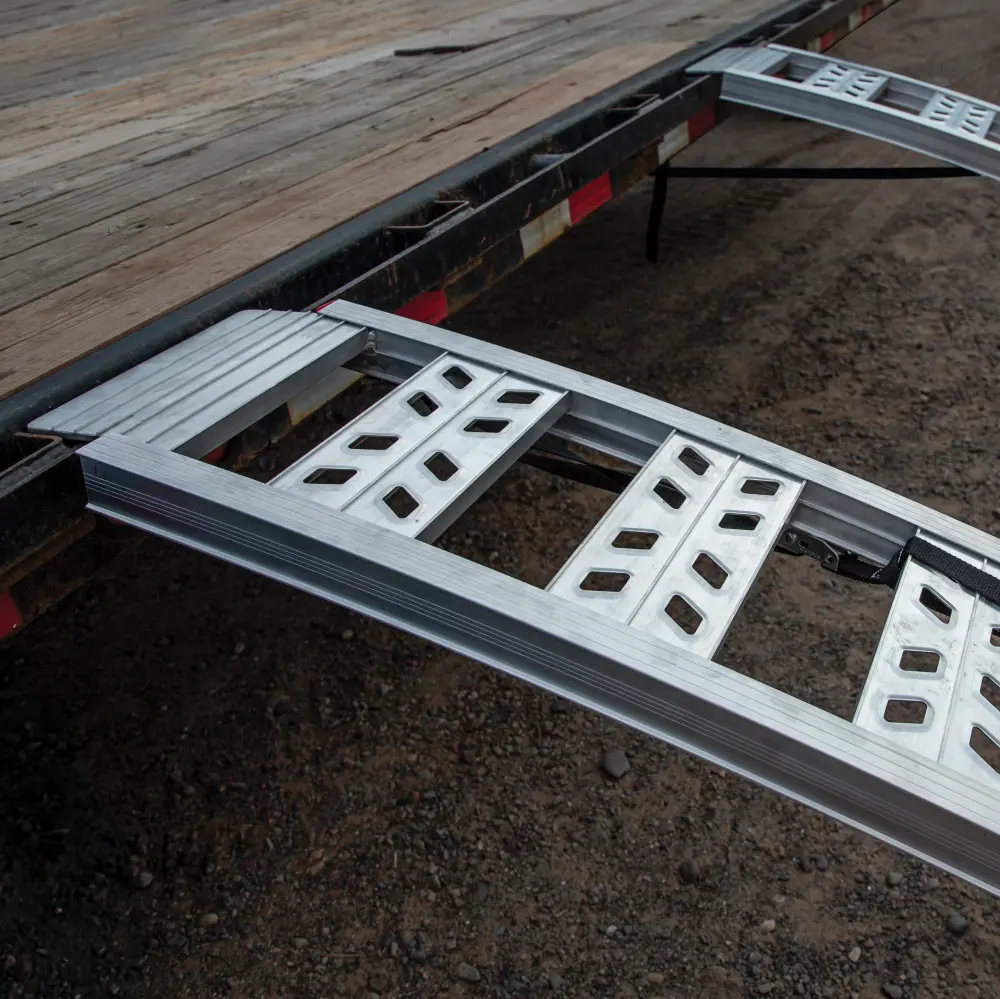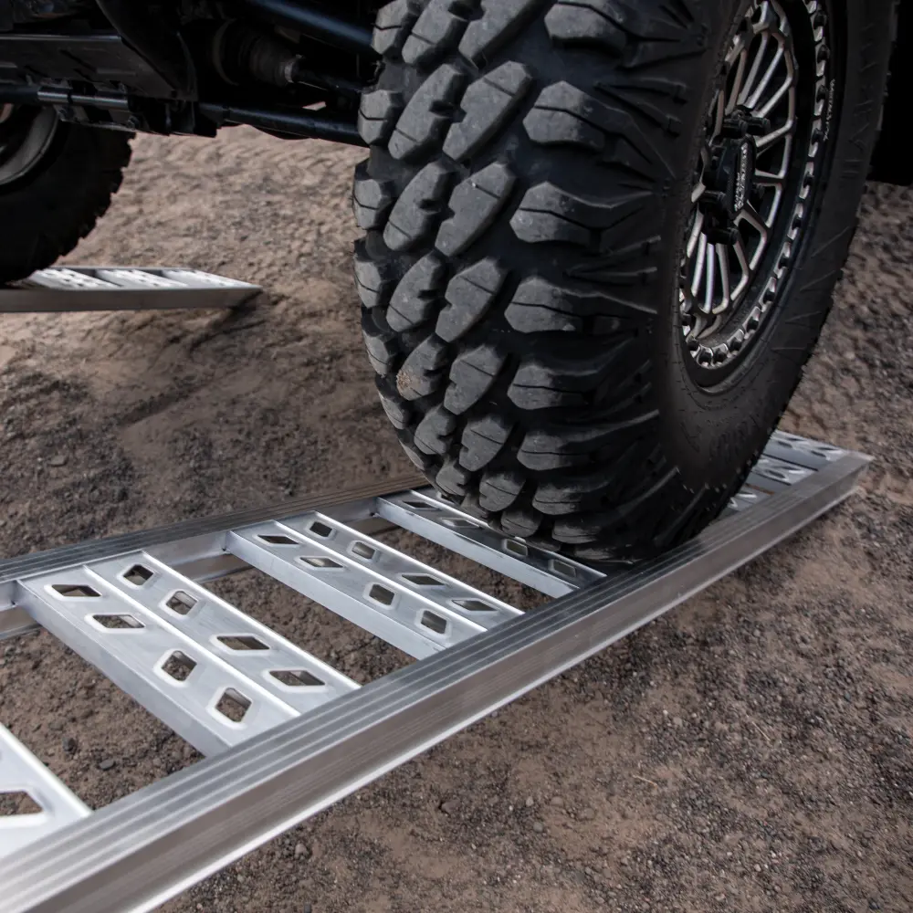 The YUTRAX® 90” Heavy-Duty Arched Ramps are built for the toughest jobs. The pair’s heavy-duty 3,000 lb. load capacity (1,500 lb. each) makes them perfect for loading even the heaviest ATVs and UTVs. Additionally, the arched design prevents bottoming out when loading low clearance recreational equipment such as riding lawn mowers and golf carts. The ramp pair is built with high strength extruded lightweight metal with an all-welded design to ensure no parts become loose over time. The heavy-duty side rails help to support the greater load capacity, while the wide rung design minimizes the gap between each rung allowing for seamless loading, even for small-wheeled equipment. In addition, each rung is embossed to provide superior traction while you are loading and unloading. While the thorough width top plate maximizes the connection between the ramp and your truck or trailer. The YUTRAX® 90” Heavy-Duty Arched Ramps are rustproof and stand up to corrosion providing you many years of use. Included wi