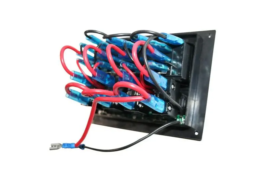 3x Rocker & 1 Momentary switches. Individual resettable circuit breakers for each switch. 1x15A, 1x10A, 2x5A breakers. Individual Lights for each breaker & Switch. In “ON” Position – Green lighted. In “OFF” Position – Red lighted. Customized ID Inserts for Each Switch Marker Lightweight – includes 50 inserts. IP68 Extreme water resistance. Auto-Marine-Powersports-In-Cab-Outdoor. Front facing pops off to access breakers for resetting.