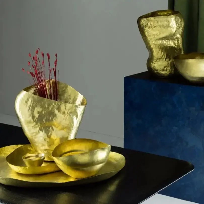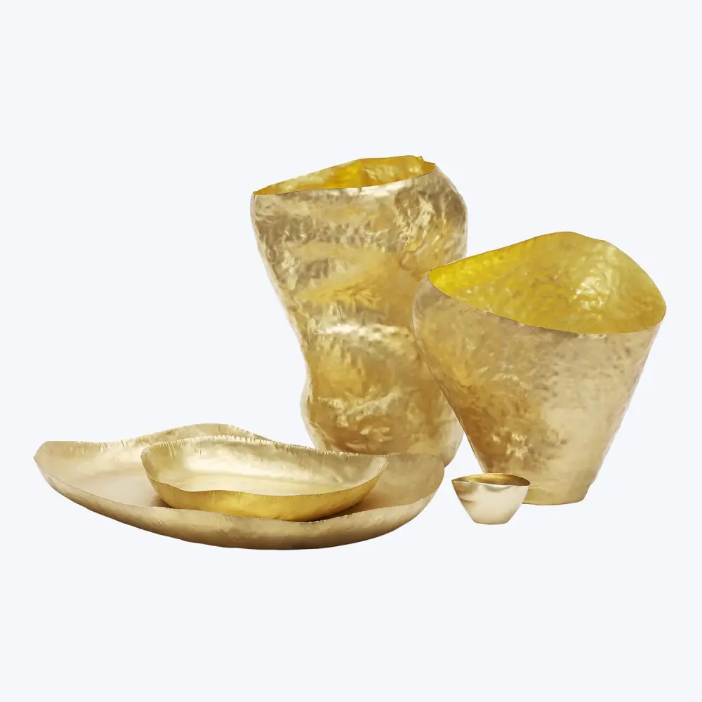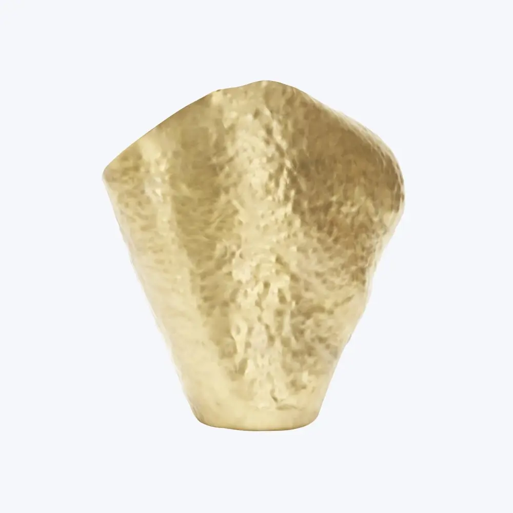 Appropriately named, Bash vessels are formed from a single brass sheet and hammered into shape by hand, creating an expressive crumpled form in a lavish glossy gold. Each Bash vessel will have a unique form due to the handmade nature of its creation. Presented in gift-worthy packaging, this gold decorative vase serves as an stunning flower vase, fruit bowl, or contemporary sculpture. Layer your mantel, dresser, or table in upmarket with the Bash Polished Gold Brass Vase Vessel – Wide.