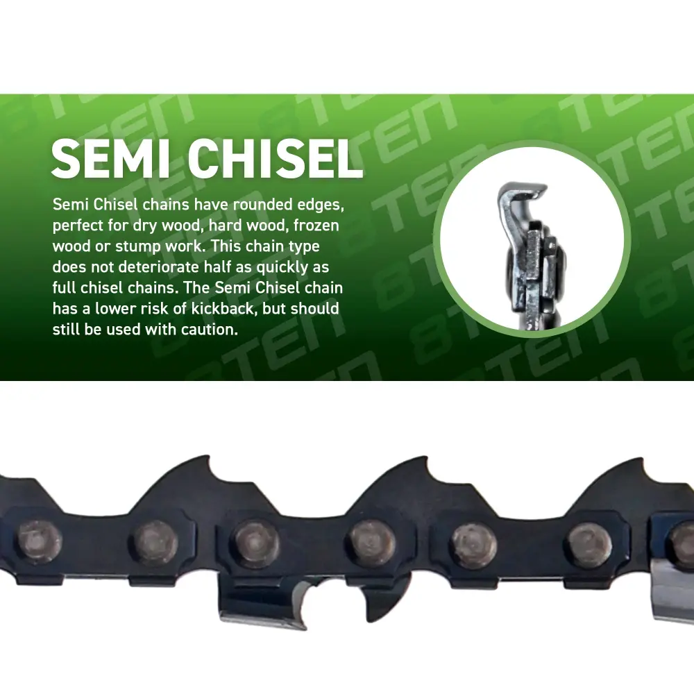 - Chainsaw Chain Specs – 16 Inch; 58 Drive Links; 3/8 Inch Low Profile Pitch; .050 Inch Gauge; Semi Chisel; UL Certified; Features Safety Bumper Link; Chain Material 68CrNiMo33 Steel; Rivet Material GCr15 Steel