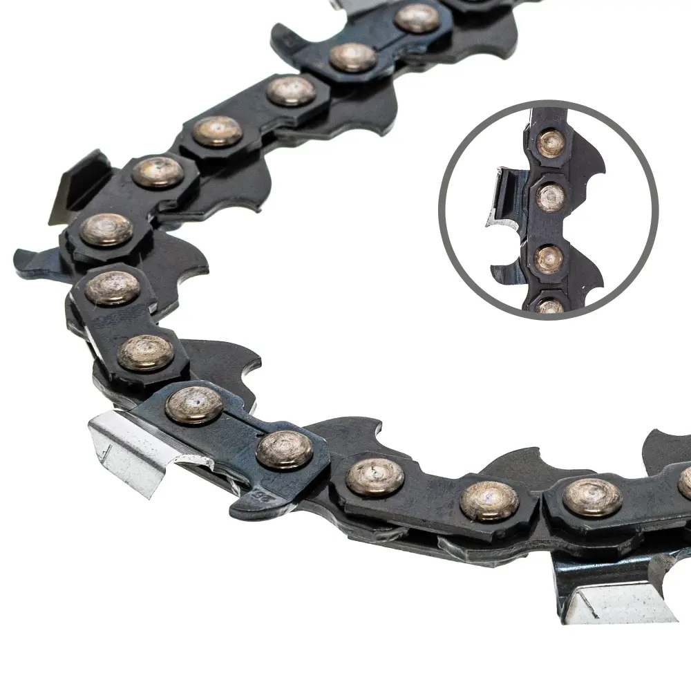 - Chainsaw Chain Specs – 28 Inch; Full Chisel; 92 Drive Links; 3/8 Inch Pitch; .063 Inch Gauge; Contains Safety Bumper Link; Chain Material 68CrNiMo33 Steel; Rivet Material GCr15 Steel
