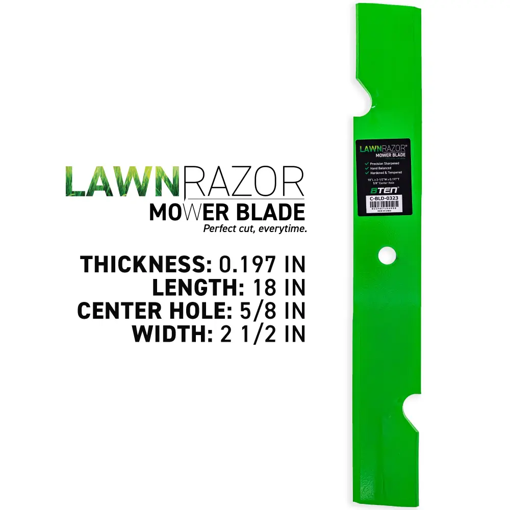 - Blade Lift Type Medium Lift; Length (in) 18in; Width (in) 2.5in; Thickness (in) 0.197in; Center Hole (in) 5 8″ Center Hole