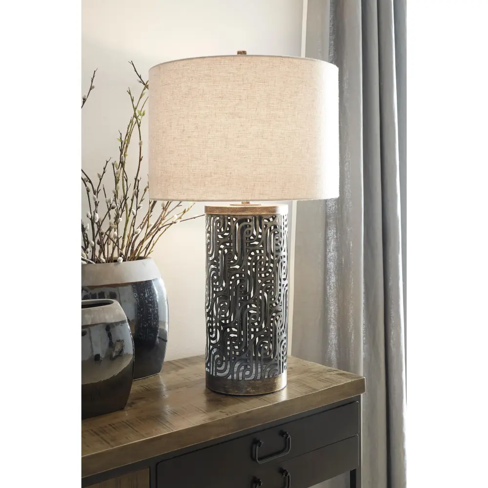 The open concept swirls of this table lamp bring presence and intrigue to any room. Antique gray and gold finished metal contrast beautifully against the lightweight drum shade. Surely, this is contemporary style fully realized.