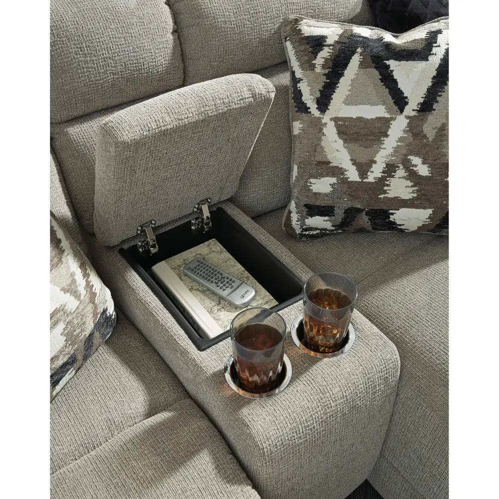 This console with storage incorporates two cup holders, a contemporary style and a stone upholstery.
