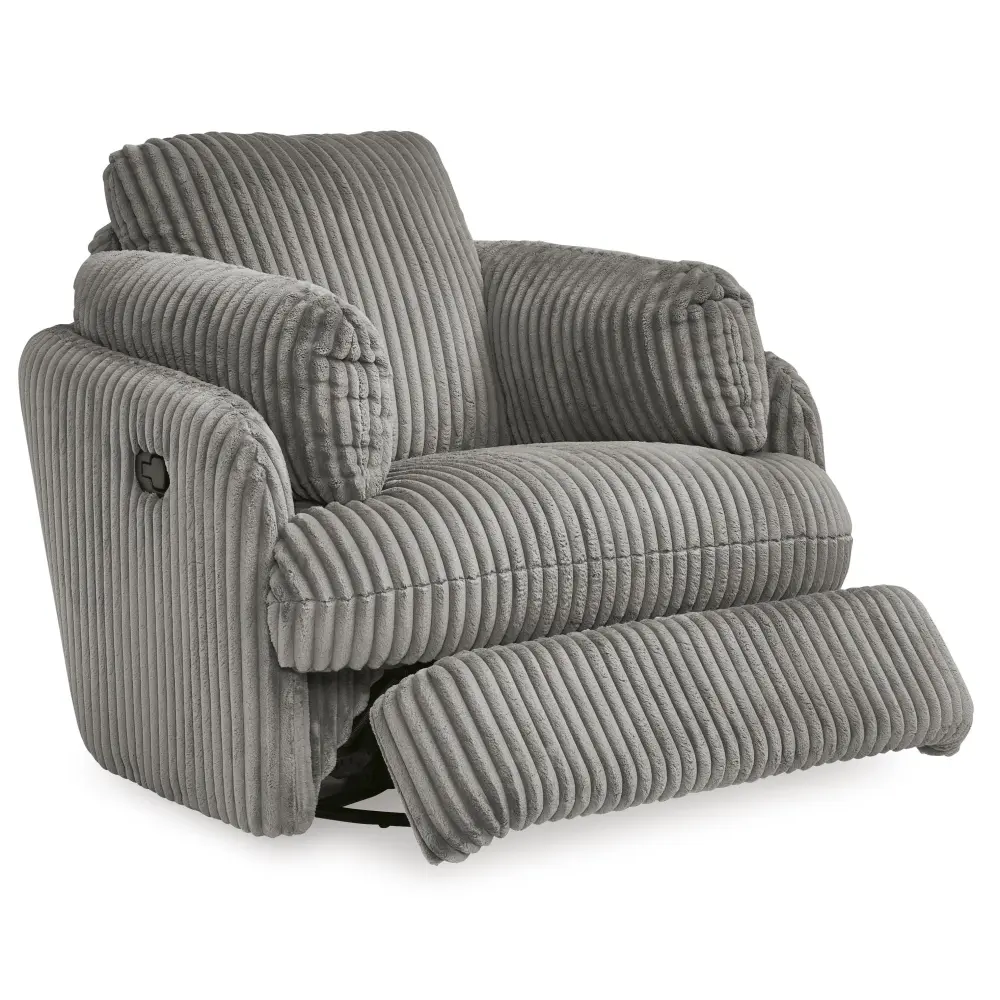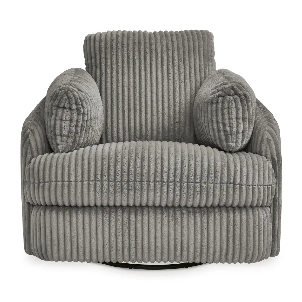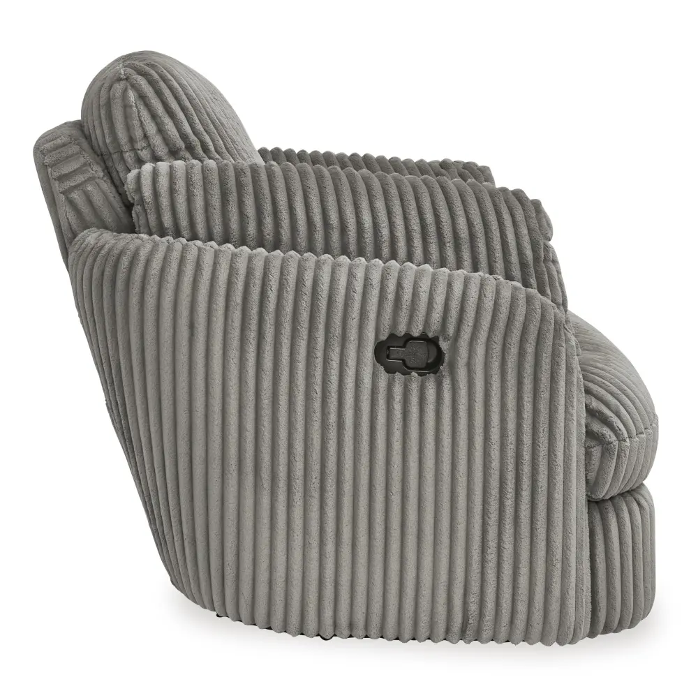 Like a warm hug, this recliner envelops you in comfort with its barrel shape and soft cord upholstery. It reclines, glides, and swivels to cater to your every need. This chair also features posh bolster pillows and cleverly designed storage. Unwind and cuddle up in your new cozy arrange.