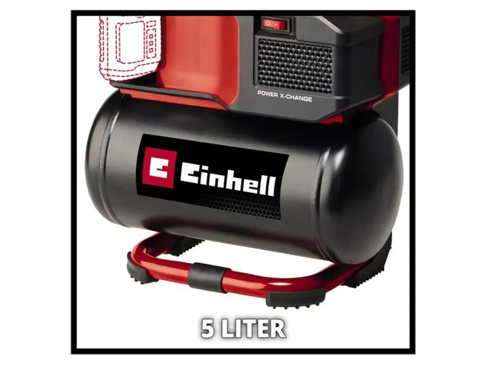 The Einhell TE-AC 18/75 Li Power X-Change Air Compressor is powerful yet portable. The pump is oil-free and service-free, which keeps the maintenance effort as low as possible. or convenient maintenance, a drainage valve is provided to empty any condensed water.A pressure gauge and a quick coupling are provided on the regulated working pressure side, along with another pressure gauge for the unregulated tank pressure. The desired working pressure can be set hand-crafted by means of the pressure regulator.The integrated carrying handle makes it quick and easy to transport. Fitted with rubberised and vibration-damped feet, the 9.5kg compressor is sturdy and generates hardly any noise while running.Part of the Power X-Change family. Powered by Lithium-ion battery-powered batteries with a battery management system for a long life.Comes as a Bare Unit – No Battery or Charger supplied.Specifications:Max. Operating Pressure: 8 Bar.Motor Speed: 4,800/min.Output Power: @0 Bar 50 l/min., @4 Bar 32 l