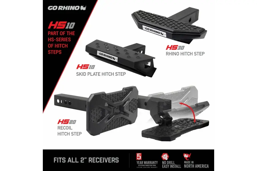 The HS-10 Skid Plate Hitch Step is an all-steel hitch step that mounts into a standard hitch receiver. The exclusive hex formed steel tread pattern delivers a non-slip step.