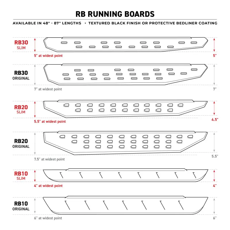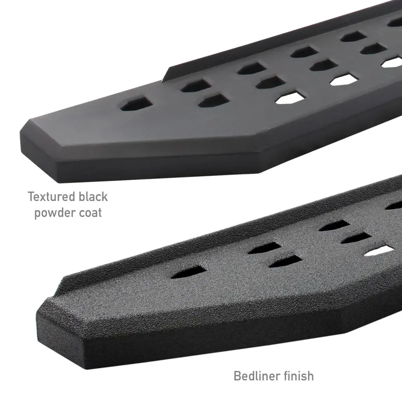The legendary RB Series of cab length running boards from Go Rhino will make your truck, Jeep or SUV stand apart from the crowd. With an aggressive, yet stylish appearance, these bolt-on side steps take their visual inspiration from the Ford Raptor but are made for more than just looks. The RB20 running boards have perforated holes punched into the surface of the step, which gives maximum traction and prevents mud, ice, and snow from accumulating. The corrosion-resistant 16-gauge zinc coated steel steps are mounted high and tight, giving them plenty of clearance for off-road adventures, and are strong enough to support hundreds of pounds of weight. The welded, boxed end design is offered in two finishes: textured black powder coat or rugged, bedliner coating. RB20 Running Boards come with a Limited Lifetime warranty on materials and construction and a 5 year warranty on the Textured Black Finish.