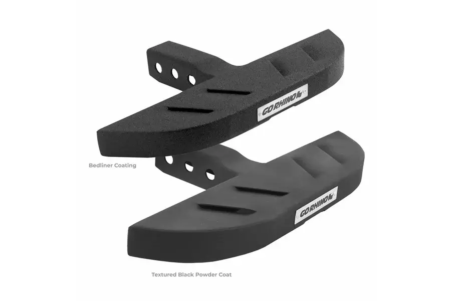 Go Rhino’s Raptor-inspired RB10 Hitch Step completes your vehicle’s stylish upgrade while offering both convenience and safety features. The archetypal louvered design matches the popular RB10 and RB10 Slim Line running boards while providing easy access to your truck bed or roof rack. The reinforced, 16-gauge zinc-coated galvanized steel construction protects your vehicle from rear-end collisions and performs with 2in hitches and standard hitch pins. The RB10 Hitch Step is available with a protective bed liner coating or textured black powder coat finish, both of which carry a 5-year limited warranty.
