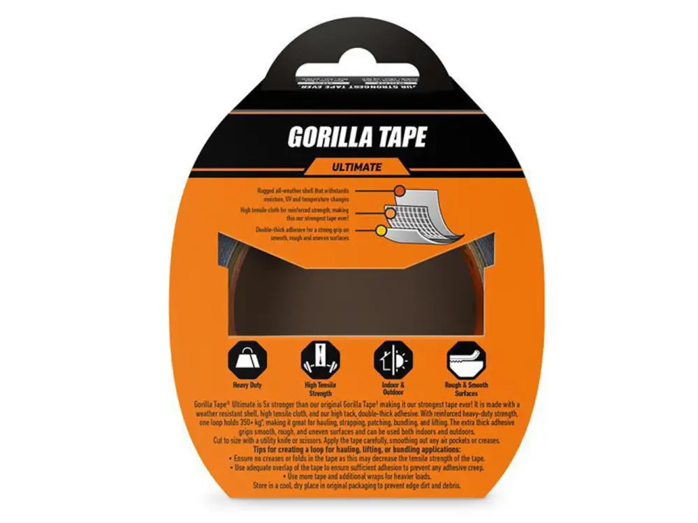 The Gorilla Tape Ultimate is 5x stronger than our original Gorilla Tape, making it our strongest tape ever! It is made with a weather resistant shell, high tensile cloth and our high-tack, double-thick adhesive.