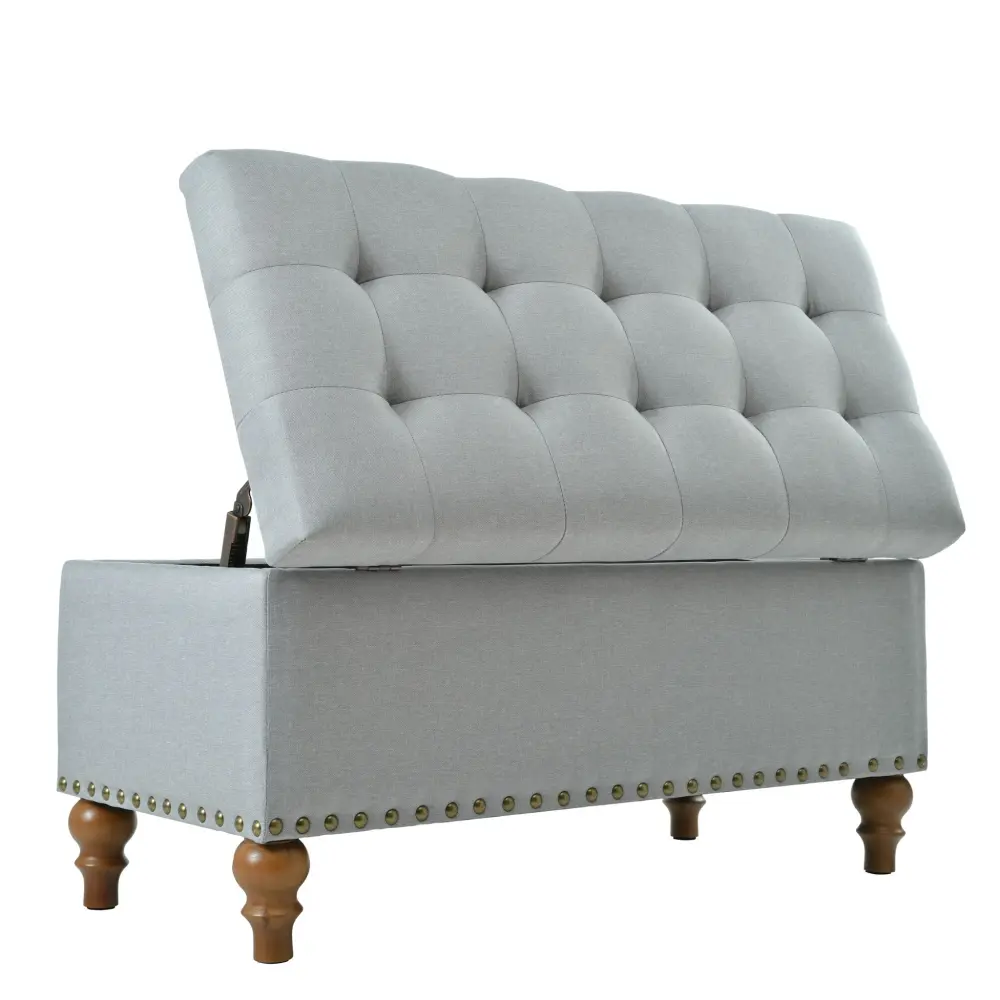 Elegant Ottoman Storage Bench With Recessed Support Hinge, Rivet Trim Linen – Gray