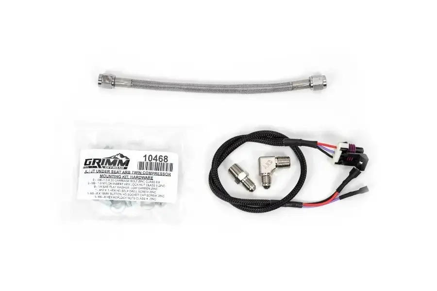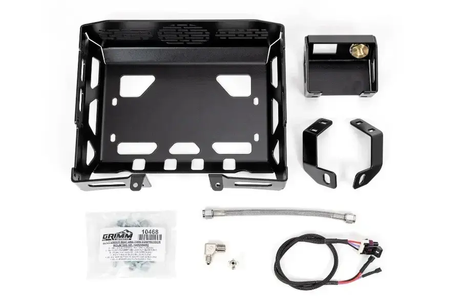 Grimm Offroad’s compact mounting bracket kit solidly mounts ARB’s Twin Air Compressor under the front seat of your 18-23 Wrangler JL, 18-23 JLU, or 20-23 Gladiator JT. This is the most functional and integrated kit on the market. The included bulkhead and wiring harness allows convenient access to the on/off switch and air chuck to the side of the front seat. By keeping the compressor inside the cab, it is kept away from the elements.