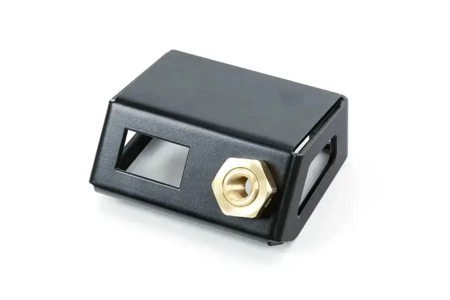 The Grimm Offroad bracket kit includes four reinforced brackets, new airline and fittings, and a wiring extender that connects to the compressor’s basic harness. Each bracket is fabricated out of steel with a black powder coat finish to protect against corrosion. The larger bracket houses the compressor itself, while two of the smaller brackets locate the compressor for installation and the last bracket mounts the s