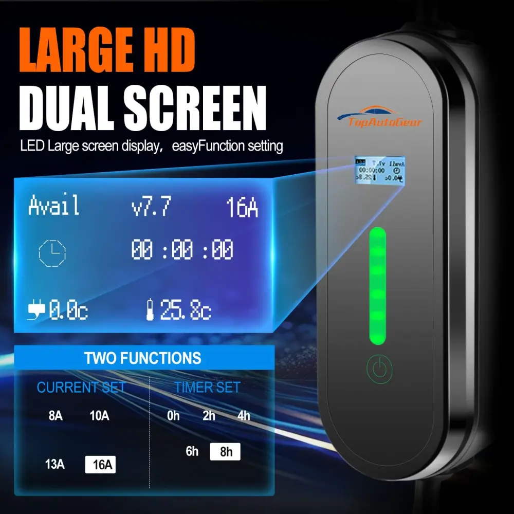 - 🔴HIGH-SPEED CHARGING EXPERIENCE: The TopAutoGear electric vehicle charger offers a maximum current output of up to 16 amps, delivering an ultra-fast charging speed for your electric car. No more worries about waiting for charging – get your vehicle ready to hit the road at a moment’s notice.