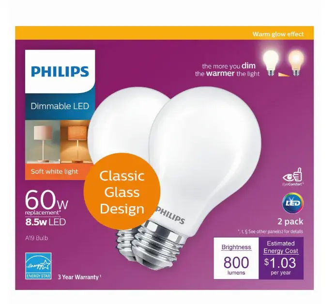 The look you love with the performance you expect. Philips 60-Watt Equivalent Frosted Plastic LED A-shape featherlight bulbs are a smart energy saving alternative to your standard incandescent with a classic glass design. This Philips 8.5-Watt LED A19 household light bulb is the perfect replacement for anywhere traditional light bulbs are used, such as table or floor lamps. It ensures a soft white light, perfect for your living room, bedroom, kitchen or any place in your home where you would use a normal incandescent light bulb.
