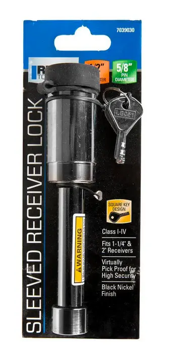 The Reese Towpower, elite black nickel, dogbone style receiver lock includes a trim black nickel sleeve to convert from 1/2 in. to 5/8 in. diameter pin. The black nickel coating provides enhanced corrosion protection. The lock features a push-button lock mechanism that allows for ease of use, the lock tumbler incorporates a dust cover to prevent debris and dirt from entering the key slot, keeping it clean and easy to use. • Designed to provide security for the ball mount from theft • For use on class I/II, or III/IV receivers • Attractive, clean black nickel finish • Virtually select proof square key design • UPC- 042899373209 • Case Packed 10 • 330pcs Available