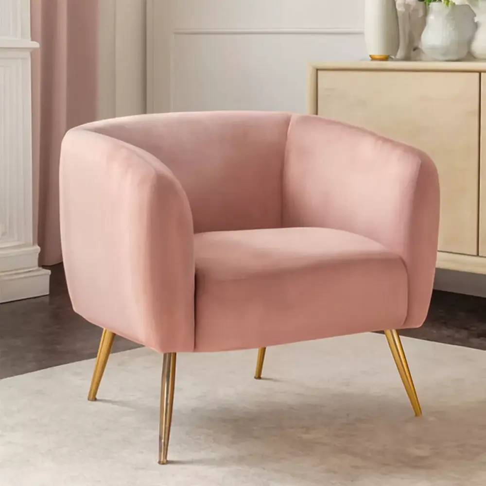 Upholstered pink plush, this armchair has a sumptuously padded seat that provides a soft and cosy seating experience. The seat, in gentle curves, rests above sleek gold finish metal legs, which elevate elegance and sophistication.